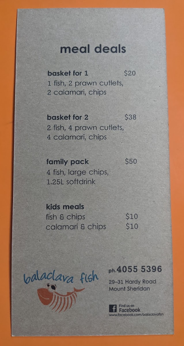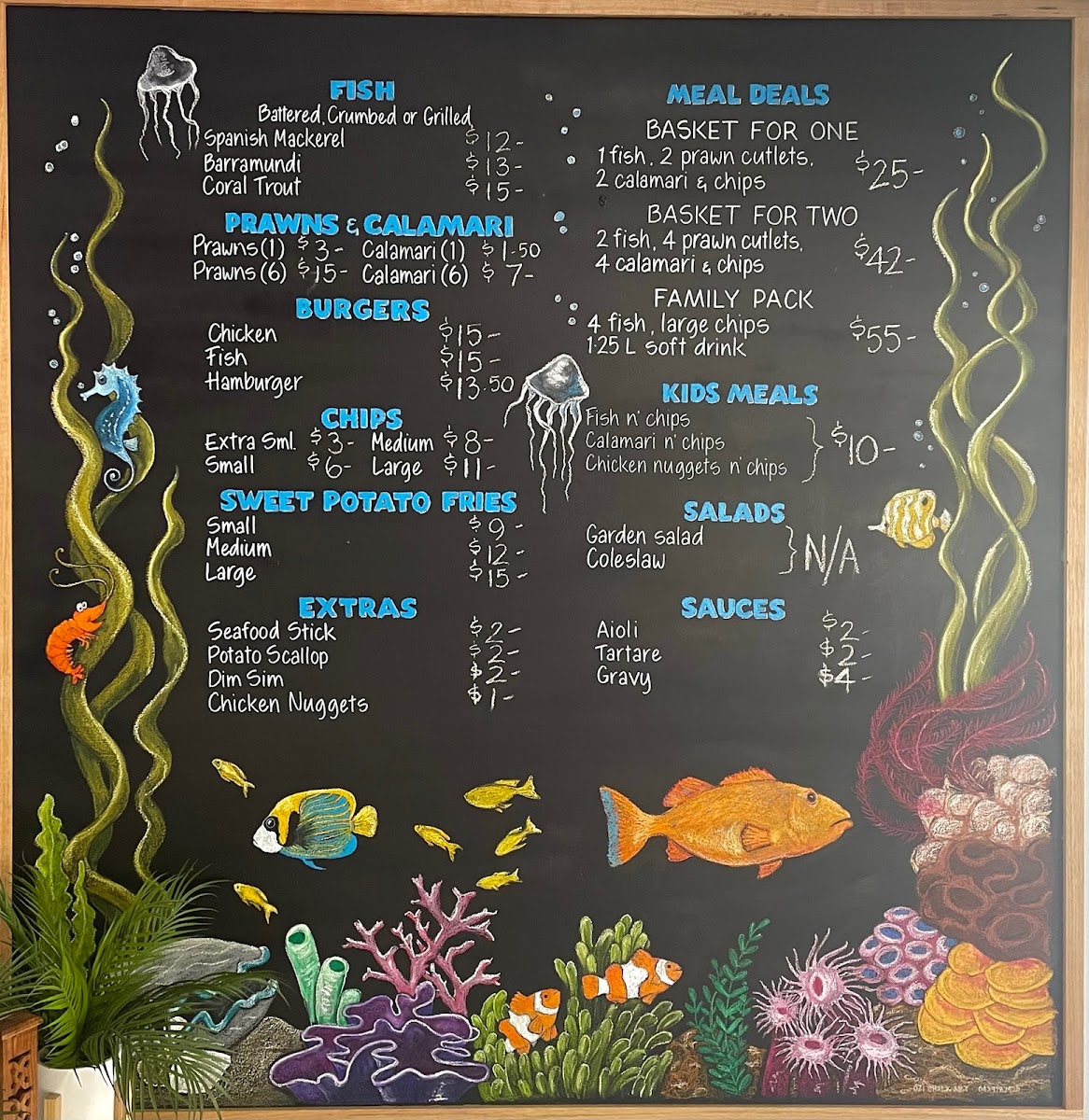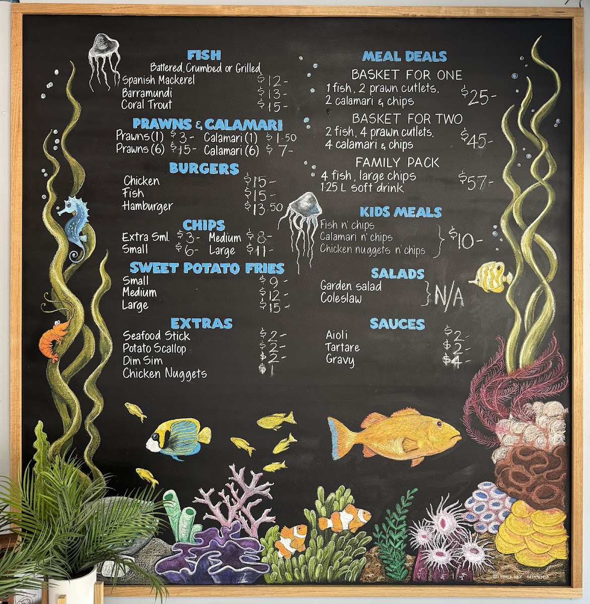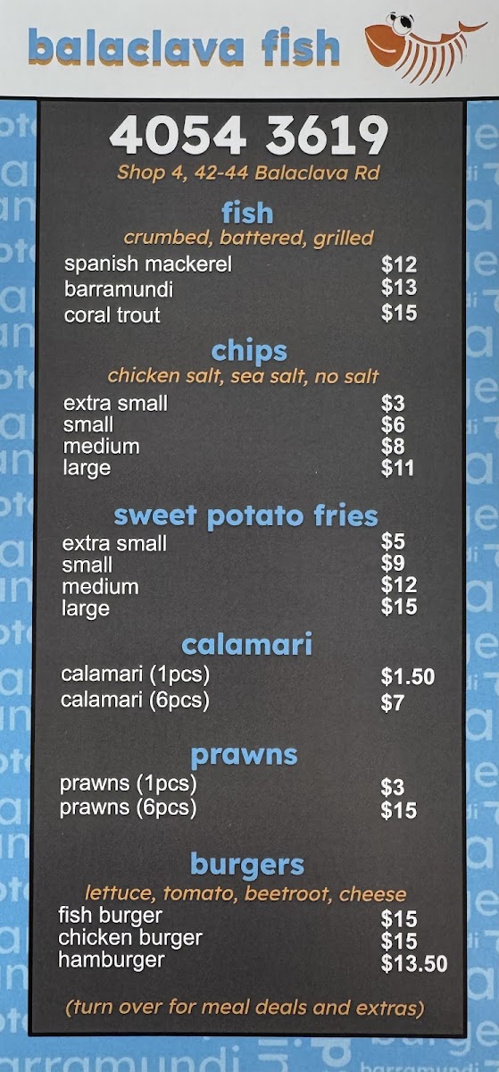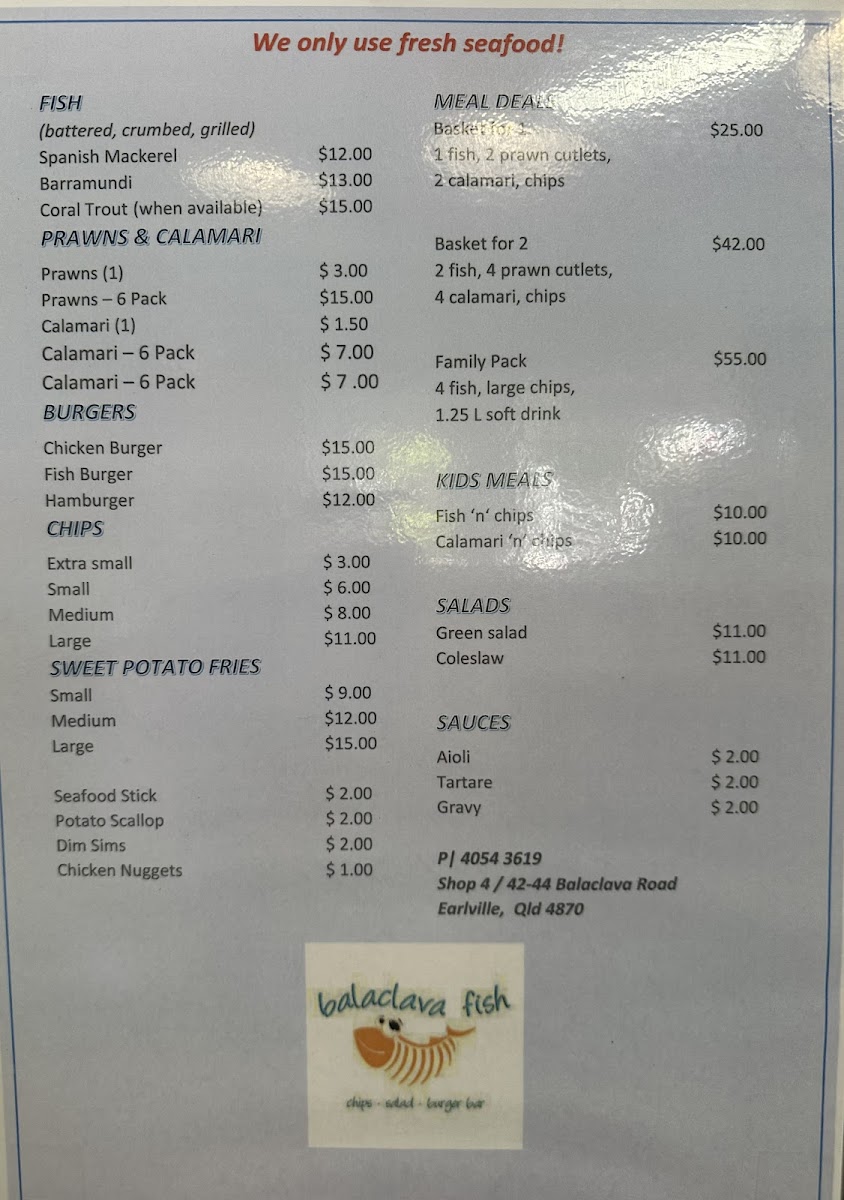 Balaclava Fish offers a menu that perfectly balances classic seafood favorites with casual comfort options, all presented with clear pricing and portion choices. For the main attractions, fresh fish selections include Spanish Mackerel, Coral Trout, and Barramundi, each promising a generous and flaky serving. The range of sides is equally flexible, with Small Chips, Medium Chips, and Large Chips, alongside Small Sweet Potato Fries, Medium Sweet Potato Fries, and Large Sweet Potato Fries catering to different appetites. Fans of shellfish will appreciate the options of Prawns (1pcs) or Prawns (6pcs) and Calamari (1pcs) or Calamari (6pcs), ideal for sharing or indulging solo. The burger selection is straightforward but satisfying, featuring a Fish Burger, Chicken Burger, and Hamburger, while extras like Potato Scallop, Dim Sim, Seafood Stick, and Chicken Nugget allow for quick add-ons. For those seeking convenience, the Basket for 1, Basket for 2, and Family Pack meal deals simplify ordering without skimping on portion. The menu also thoughtfully caters to younger diners with Kids Fish and Chips, Kids Calamari and Chips, and Kids Nuggets and Chips, making it a family-friendly destination. Overall, the menu at Balaclava Fish combines variety, approachable pricing, and the familiar flavors of fresh seafood and comfort food, making it a go-to spot for casual dining in Earlville.