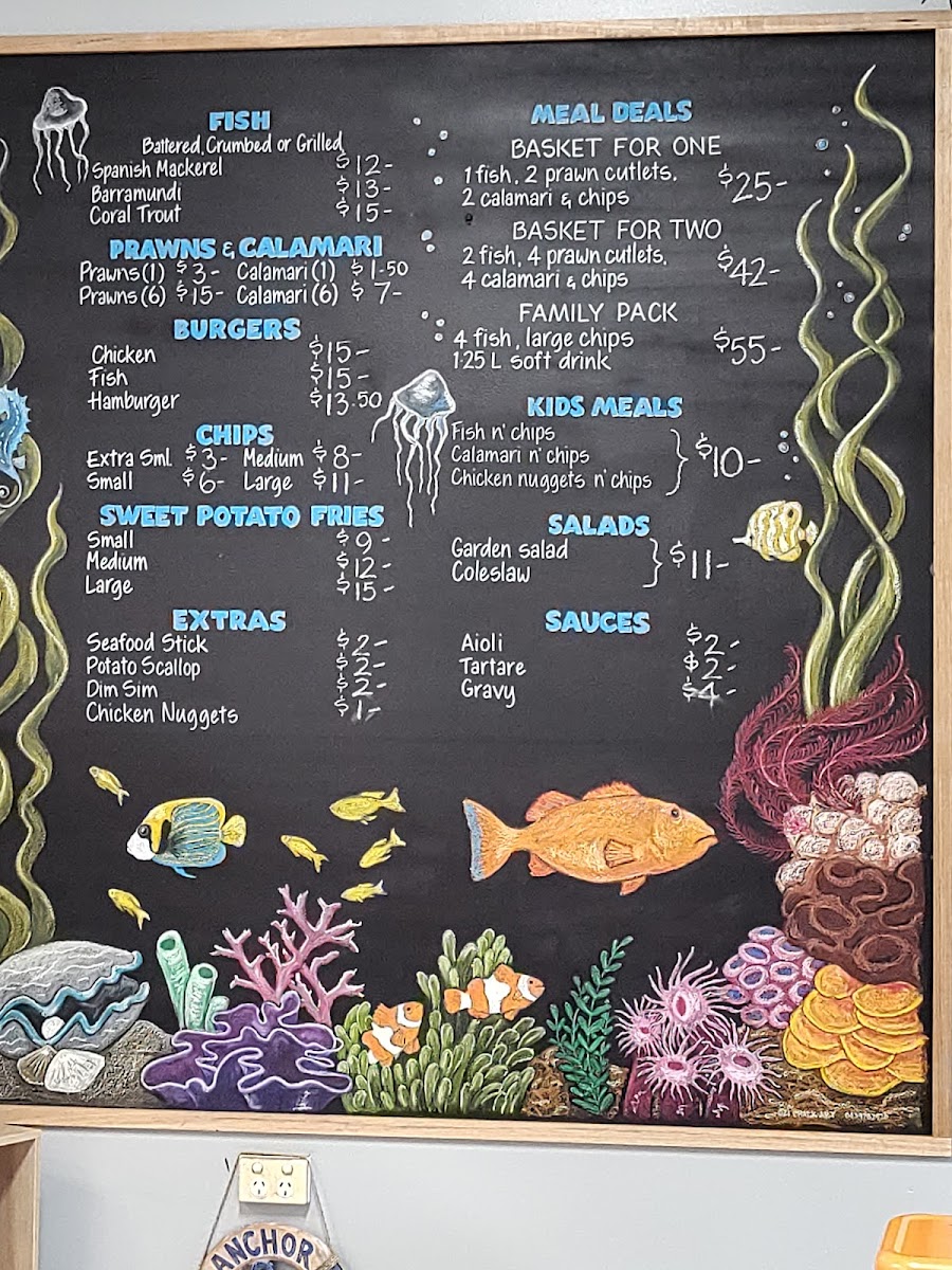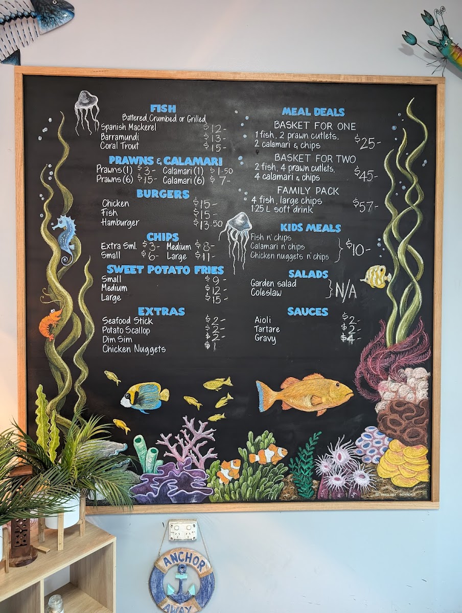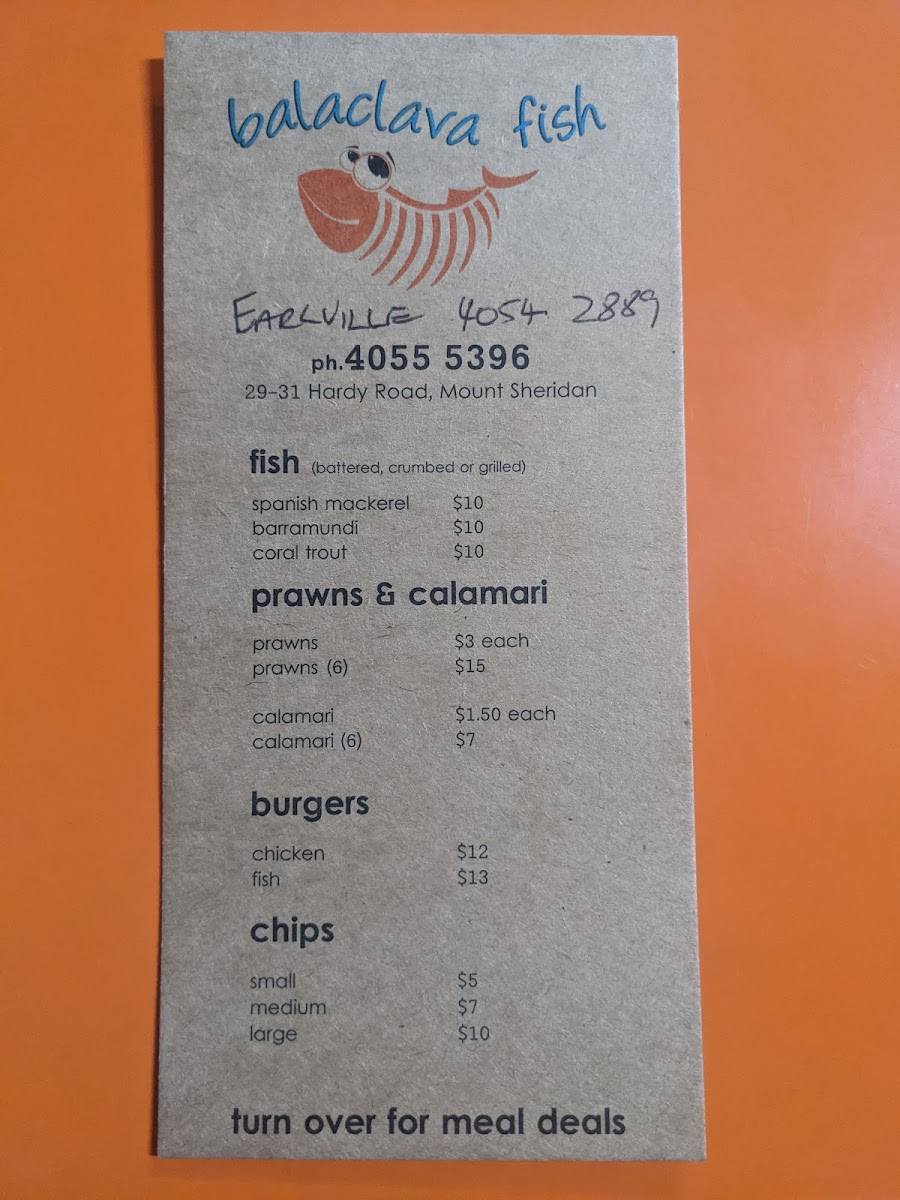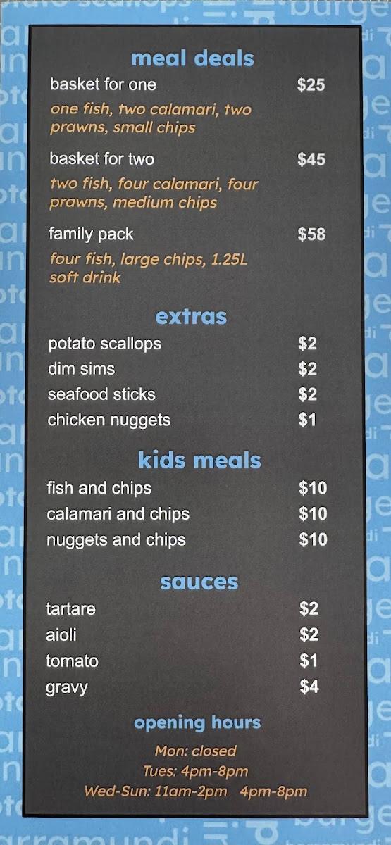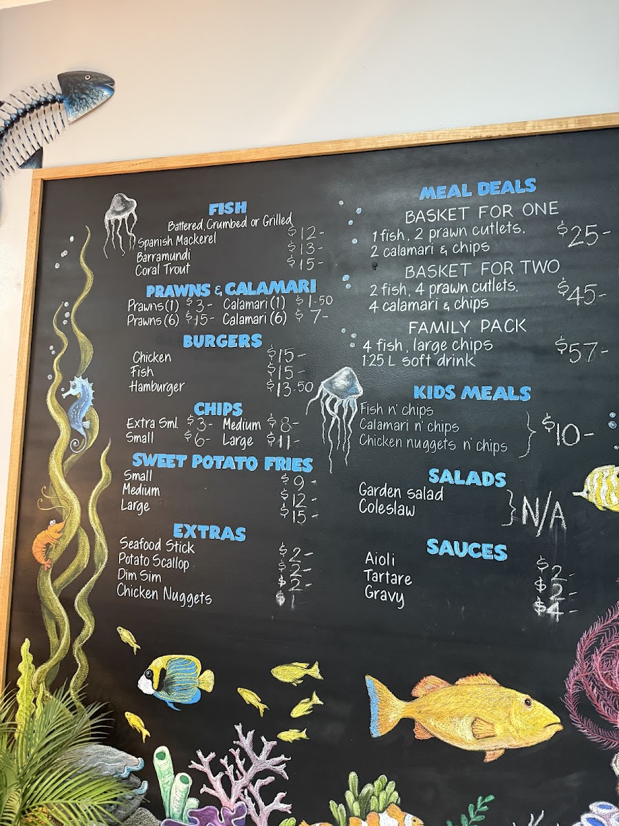 Balaclava Fish offers a menu that perfectly balances classic seafood favorites with casual comfort options, all presented with clear pricing and portion choices. For the main attractions, fresh fish selections include Spanish Mackerel, Coral Trout, and Barramundi, each promising a generous and flaky serving. The range of sides is equally flexible, with Small Chips, Medium Chips, and Large Chips, alongside Small Sweet Potato Fries, Medium Sweet Potato Fries, and Large Sweet Potato Fries catering to different appetites. Fans of shellfish will appreciate the options of Prawns (1pcs) or Prawns (6pcs) and Calamari (1pcs) or Calamari (6pcs), ideal for sharing or indulging solo. The burger selection is straightforward but satisfying, featuring a Fish Burger, Chicken Burger, and Hamburger, while extras like Potato Scallop, Dim Sim, Seafood Stick, and Chicken Nugget allow for quick add-ons. For those seeking convenience, the Basket for 1, Basket for 2, and Family Pack meal deals simplify ordering without skimping on portion. The menu also thoughtfully caters to younger diners with Kids Fish and Chips, Kids Calamari and Chips, and Kids Nuggets and Chips, making it a family-friendly destination. Overall, the menu at Balaclava Fish combines variety, approachable pricing, and the familiar flavors of fresh seafood and comfort food, making it a go-to spot for casual dining in Earlville.